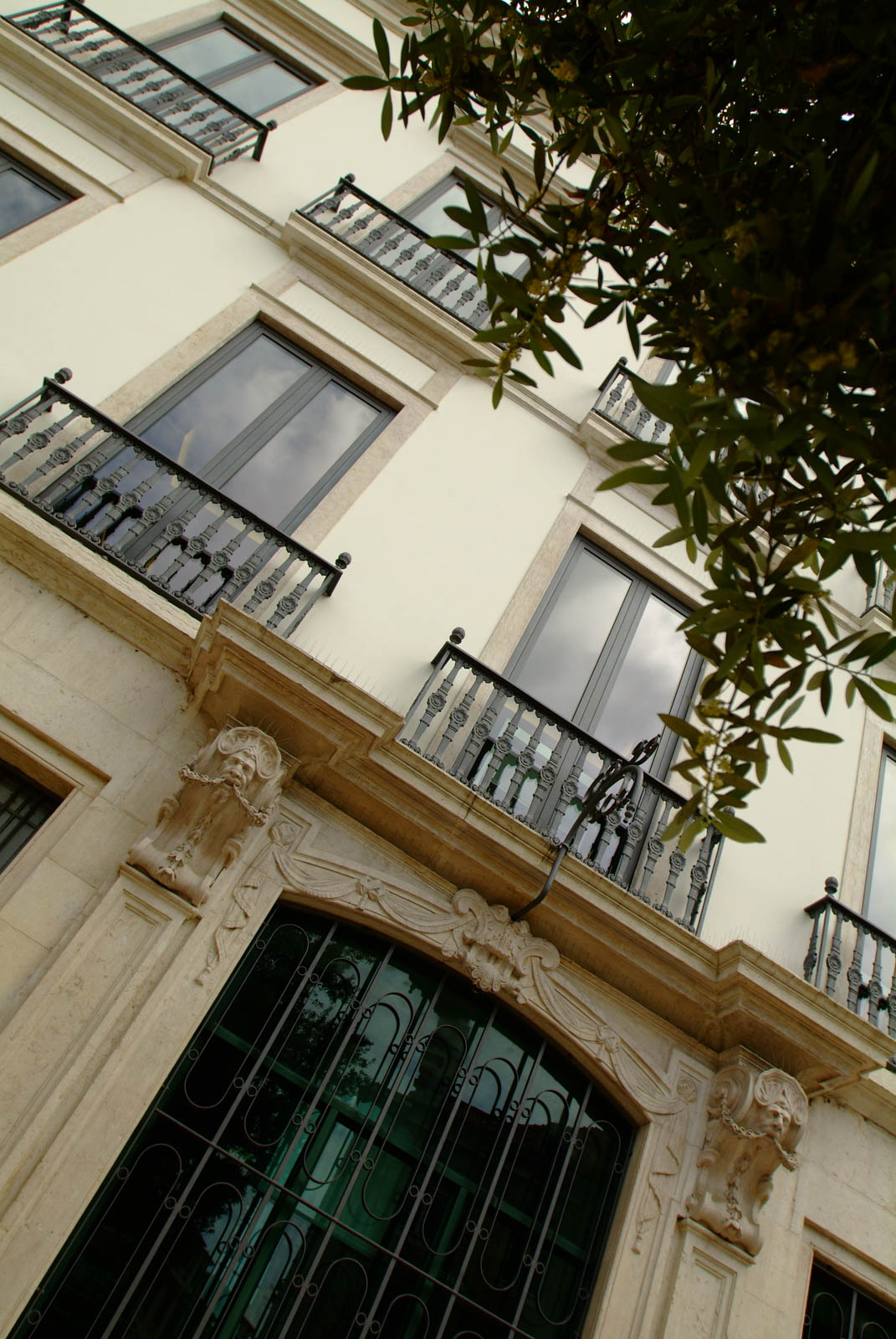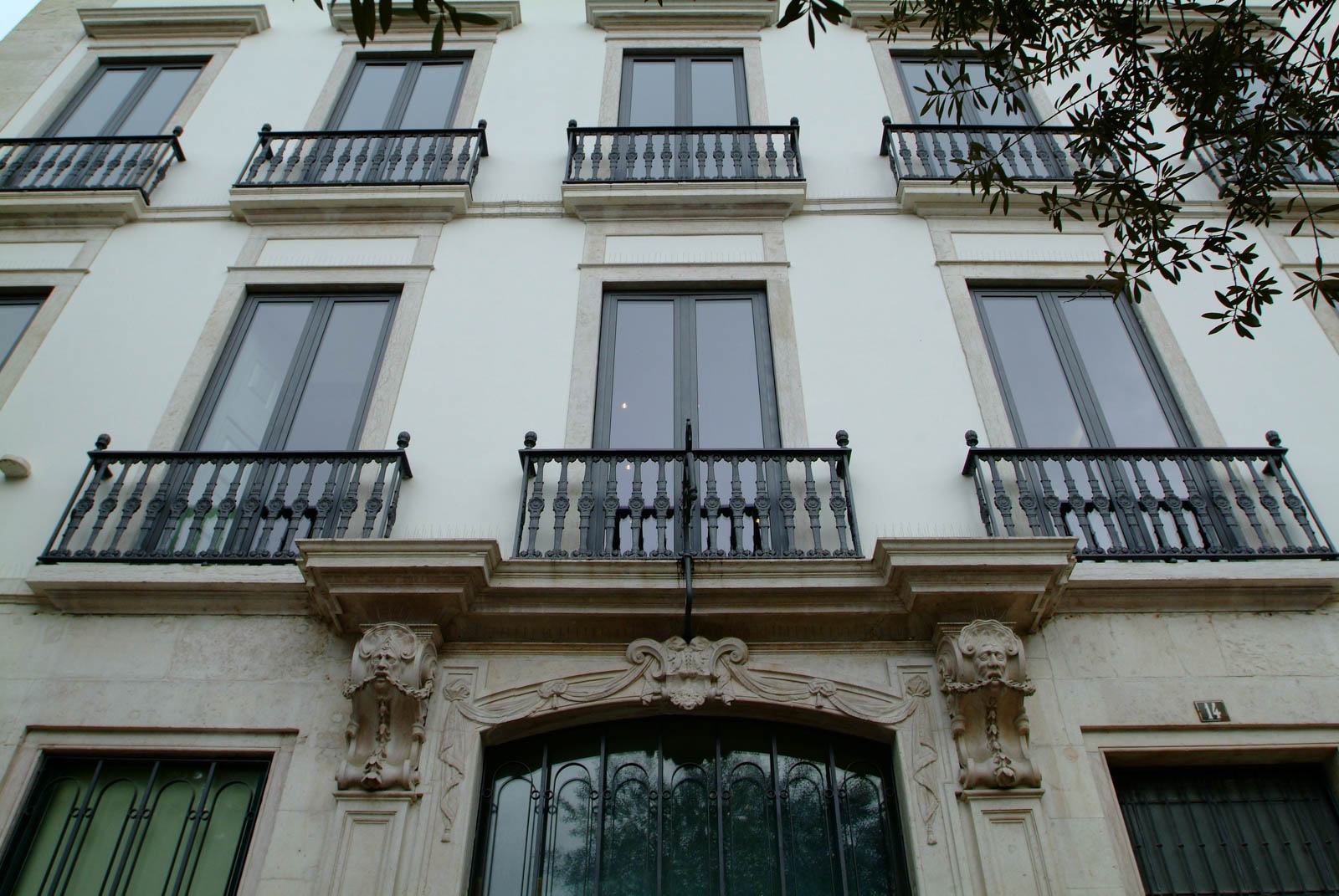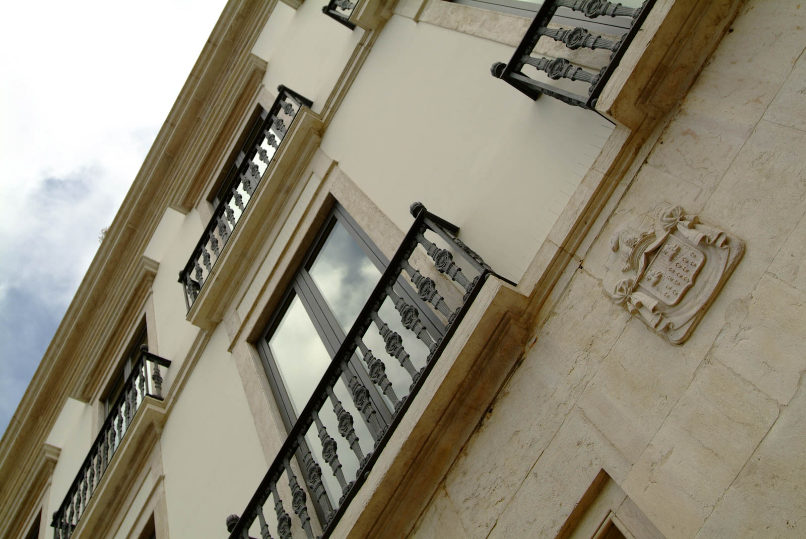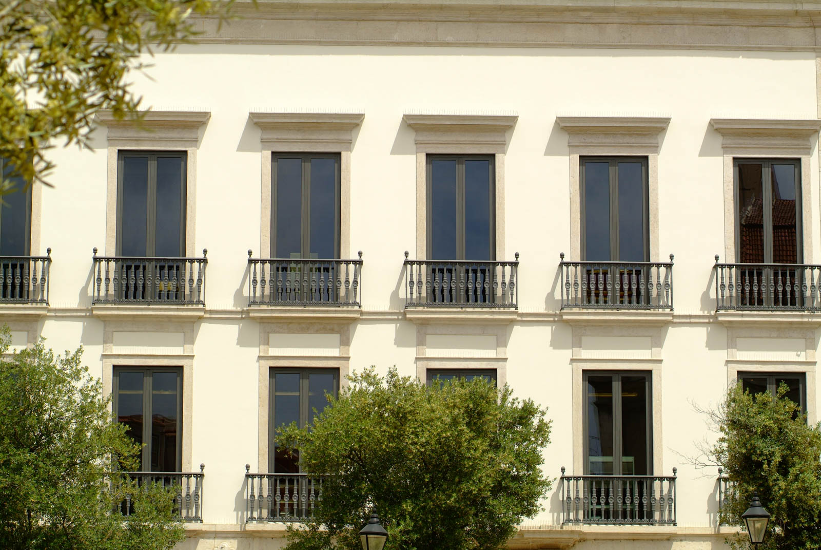 A sua fachada apresenta oito portas no piso térreo, igual número de janelas e varandins em cada um dos andares e pilastras laterais.